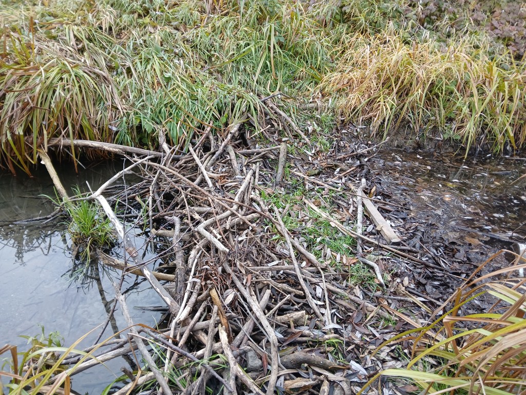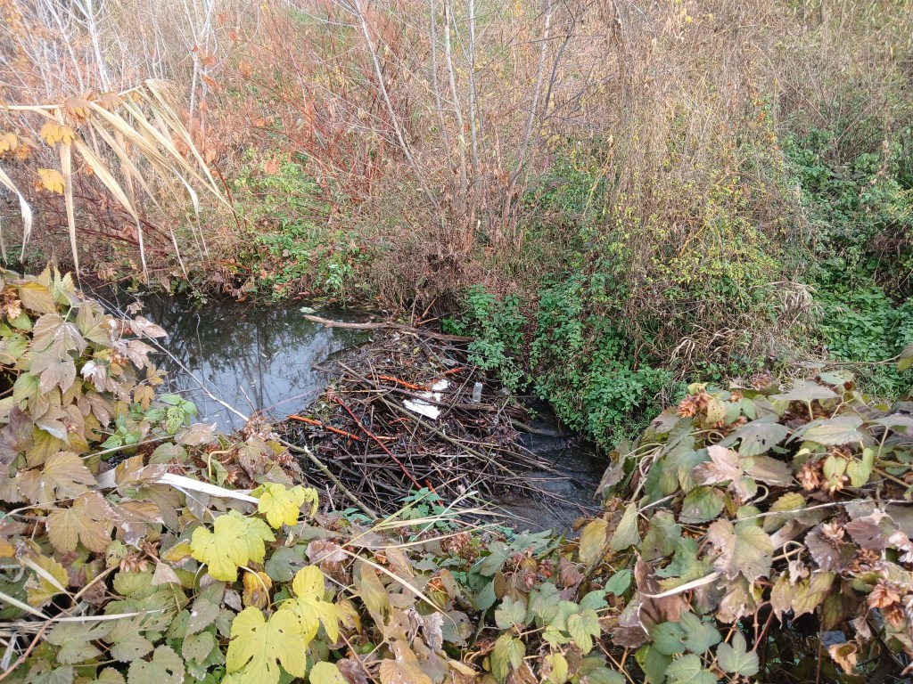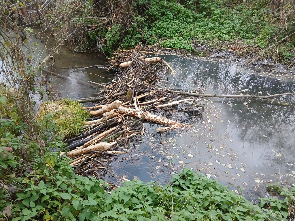 Onnantól, ahogy a lakott részek és a patak közötti távolság megnő, aktív hódélőhely nyomait találtam, a szakasz első territóriumát be is tudtam azonosítani. A territórium a duzzasztott vizét egy nagyméretű, a becslés alapján 130 cm magas gátnak köszönheti. Az alvízi rész medréből készített képeken jól látszik a gát túlfolyója és a mögötte felduzzasztott víztömeg is.