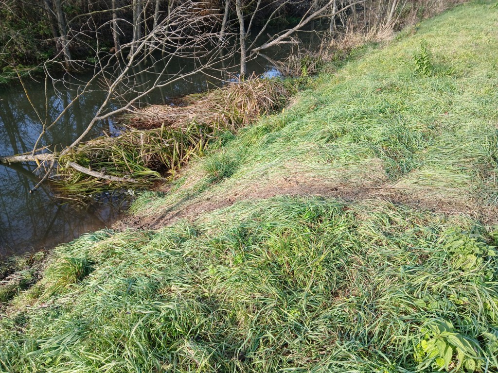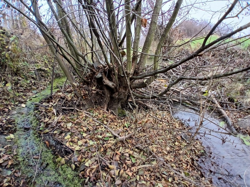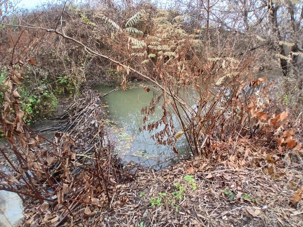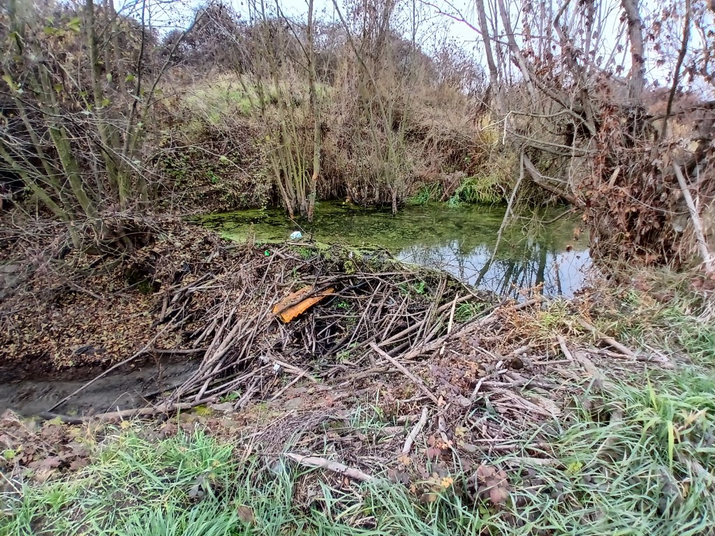 A víztározó alatti szakaszt elhagyva a lakott terület peremén, folyásirányban haladva rögtön az első métereken felfedeztem a hódok nyomait. Régebbi gátak, beszakadt üregek és egy régi vár maradványai jelezték, hogy a kertek alján végigfutó patak ezen szakasza régebben aktívabb hódélőhely volt.