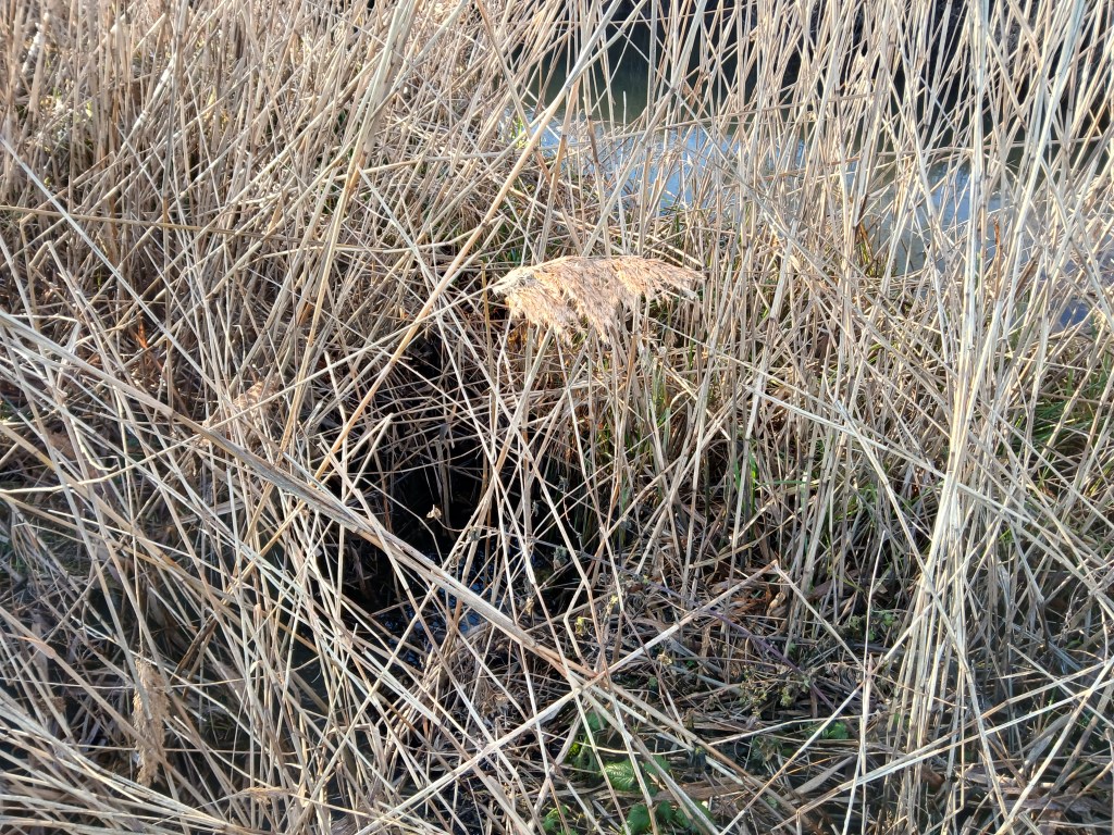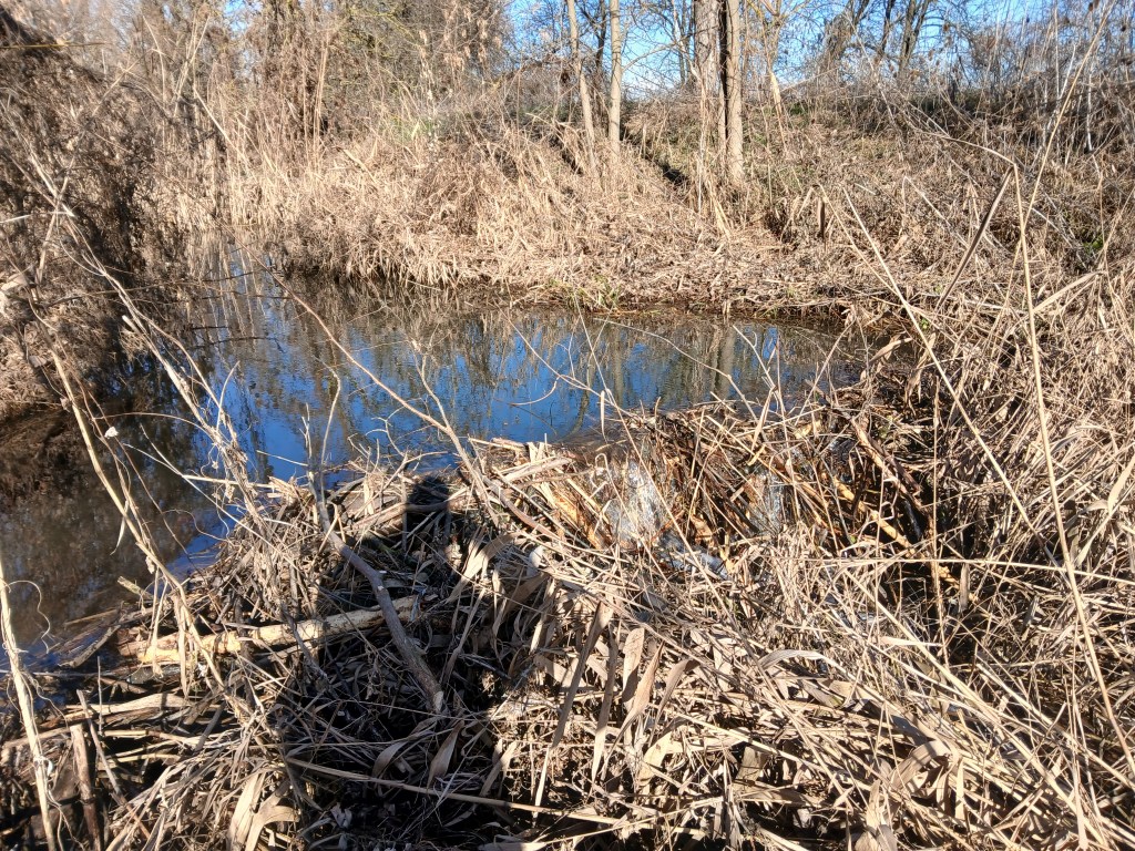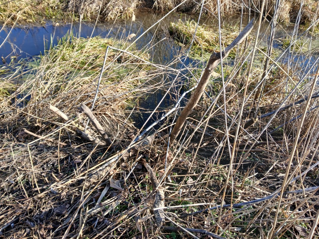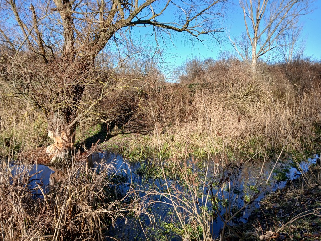 A következő, fátlan, nádassal borított, hódmentesnek mondható szakaszon tempósan áthaladva nemsokára újabb hódterritóriumhoz értem. Ennek kezdetét a kasztóreum szaga jelezte, majd sűrűsödtek a rágásnyomok, később pedig a kettő hódgát által duzzasztott patak oldalában megtaláltam a hódvárakat és üregbejáratot. Az emelkedett vízszint a környező földek talajvízszintjére is befolyással van, a töltés patakkal ellentétes oldalán jól látszódtak ennek a nyomai.