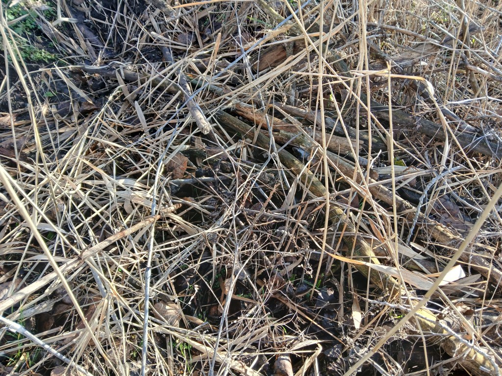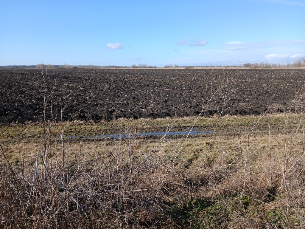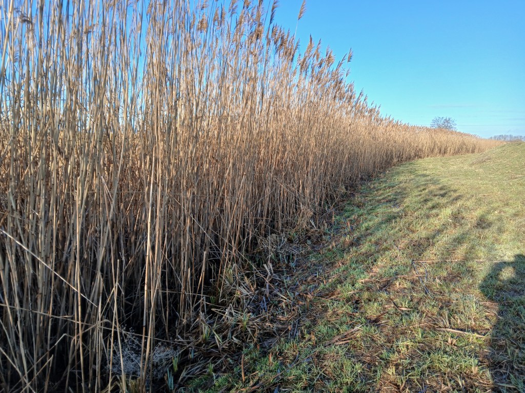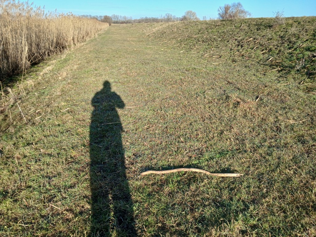 A következő, fátlan, nádassal borított, hódmentesnek mondható szakaszon tempósan áthaladva nemsokára újabb hódterritóriumhoz értem. Ennek kezdetét a kasztóreum szaga jelezte, majd sűrűsödtek a rágásnyomok, később pedig a kettő hódgát által duzzasztott patak oldalában megtaláltam a hódvárakat és üregbejáratot. Az emelkedett vízszint a környező földek talajvízszintjére is befolyással van, a töltés patakkal ellentétes oldalán jól látszódtak ennek a nyomai.