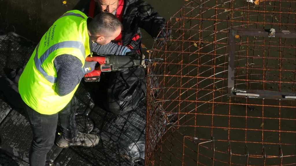 Október 13-án reggel a helyszínen megkezdődött az eszközök beépítése. Első lépéskén beemeltük a vasketrecet a hódgát felvízi oldalára, majd ott búvárok segítségével megkerestük a stabil rögzítésre alkalmas aljzatot és kimértük a gáttesttől való ideális távolságot.