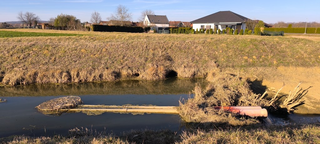 Itt már készült csőátvezetés két PVC csővel, melyek átmérője 315 milliméter, hosszuk 7,5 méter. A fémkosár betonvassal lett rögzítve a mederaljzaton. A csőátvezetés 2023 februárjában készült el. 2024-ben is írtunk más a helyszínről ebben a cikkben: https://hodterkep.blog/2024/11/17/hodmenedzsment-tanulmanyut-szloveniaban/
