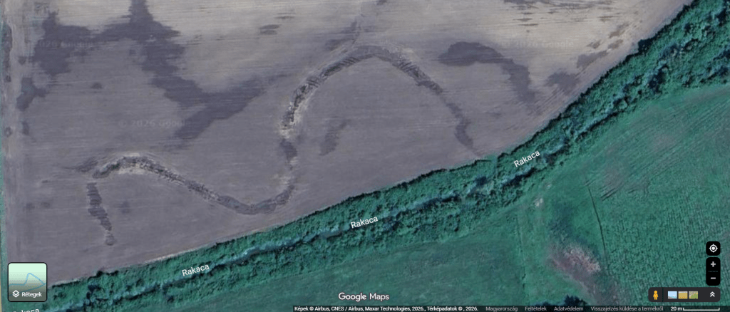A műholdfelvételen jól látszik, hogy a feltételezhetően a hódgát(ak?)nak köszönhetően emelkedett talajvízszint következtében szépen kirajzolódik a Rakaca eredeti kanyargós medre.