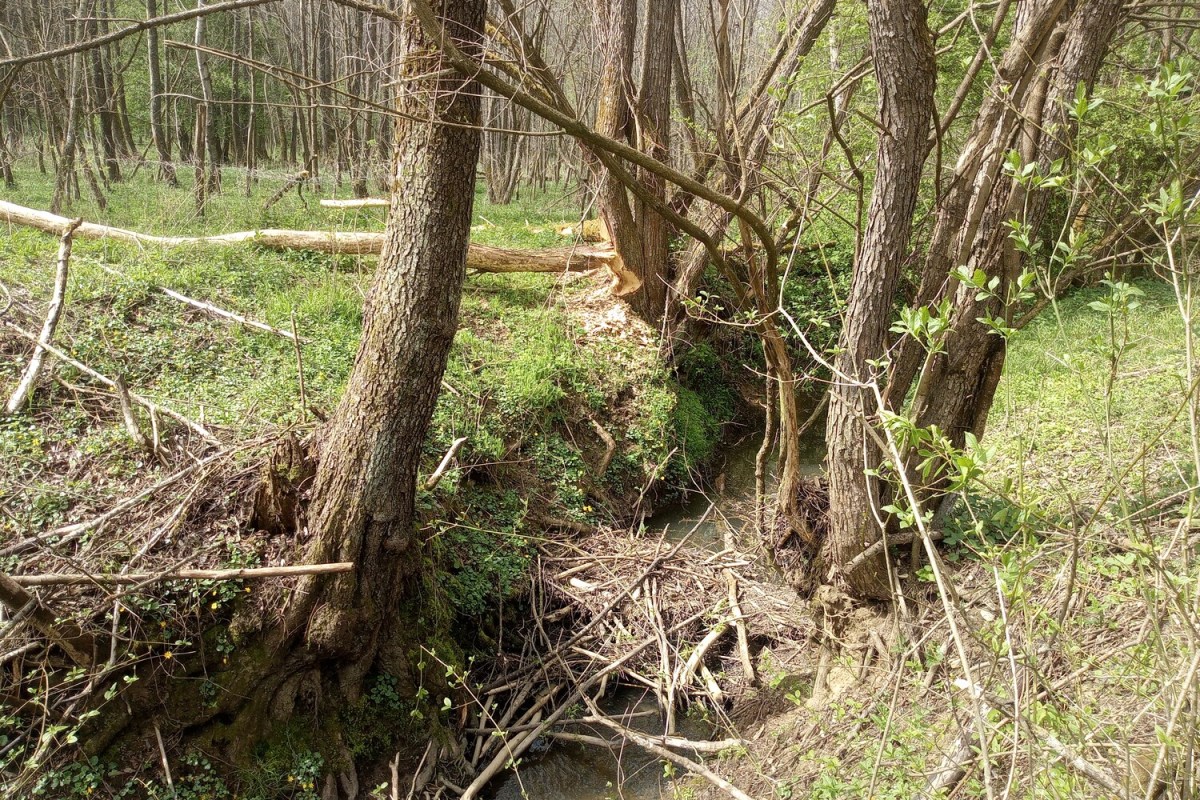 „A patak mentén mindkét irányba és a néhány méterre lévő aszfaltos út mentén fiatal kidöntött fák találhatók, de van több befaragott, közel méteres átmérőjű fűzfa is.”